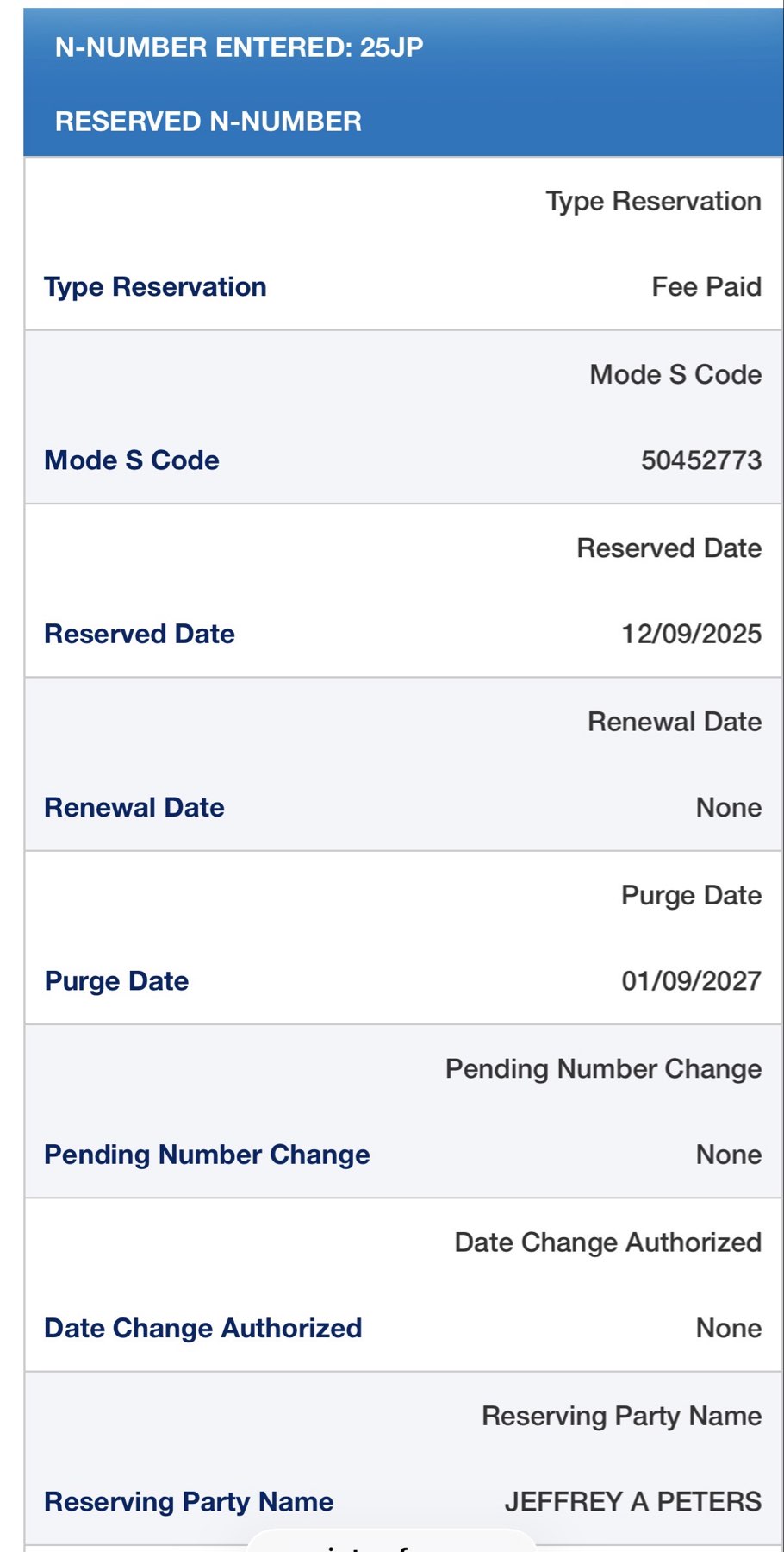 Another big milestone, got my N number reserved, she will officially be N25JP