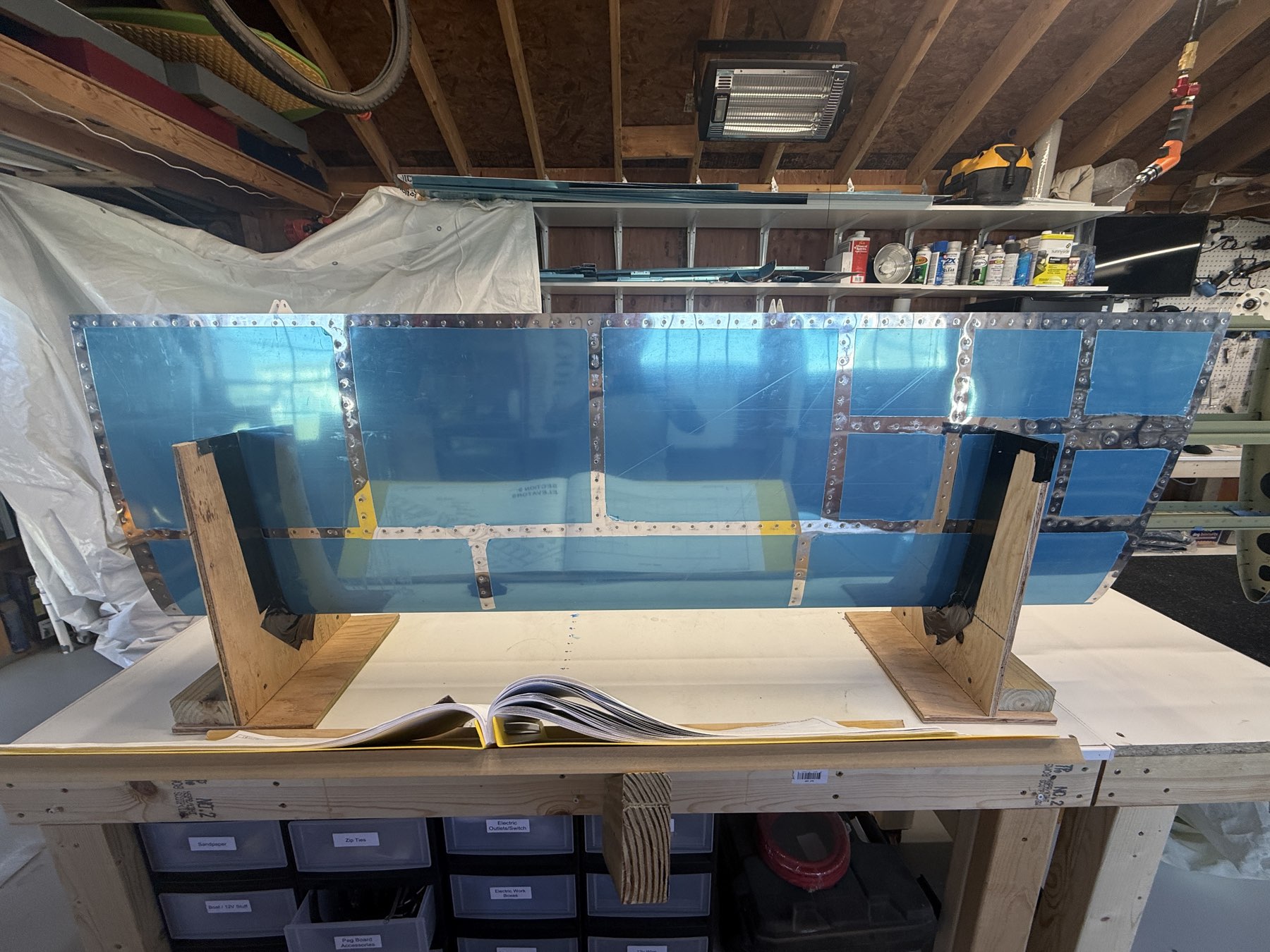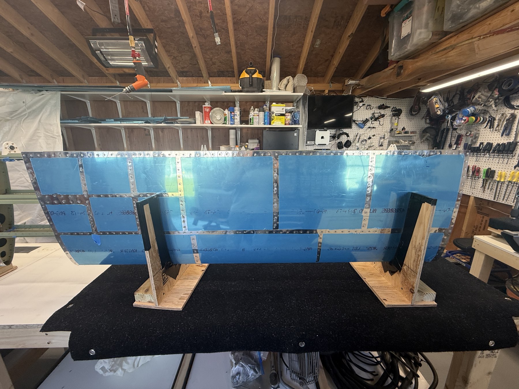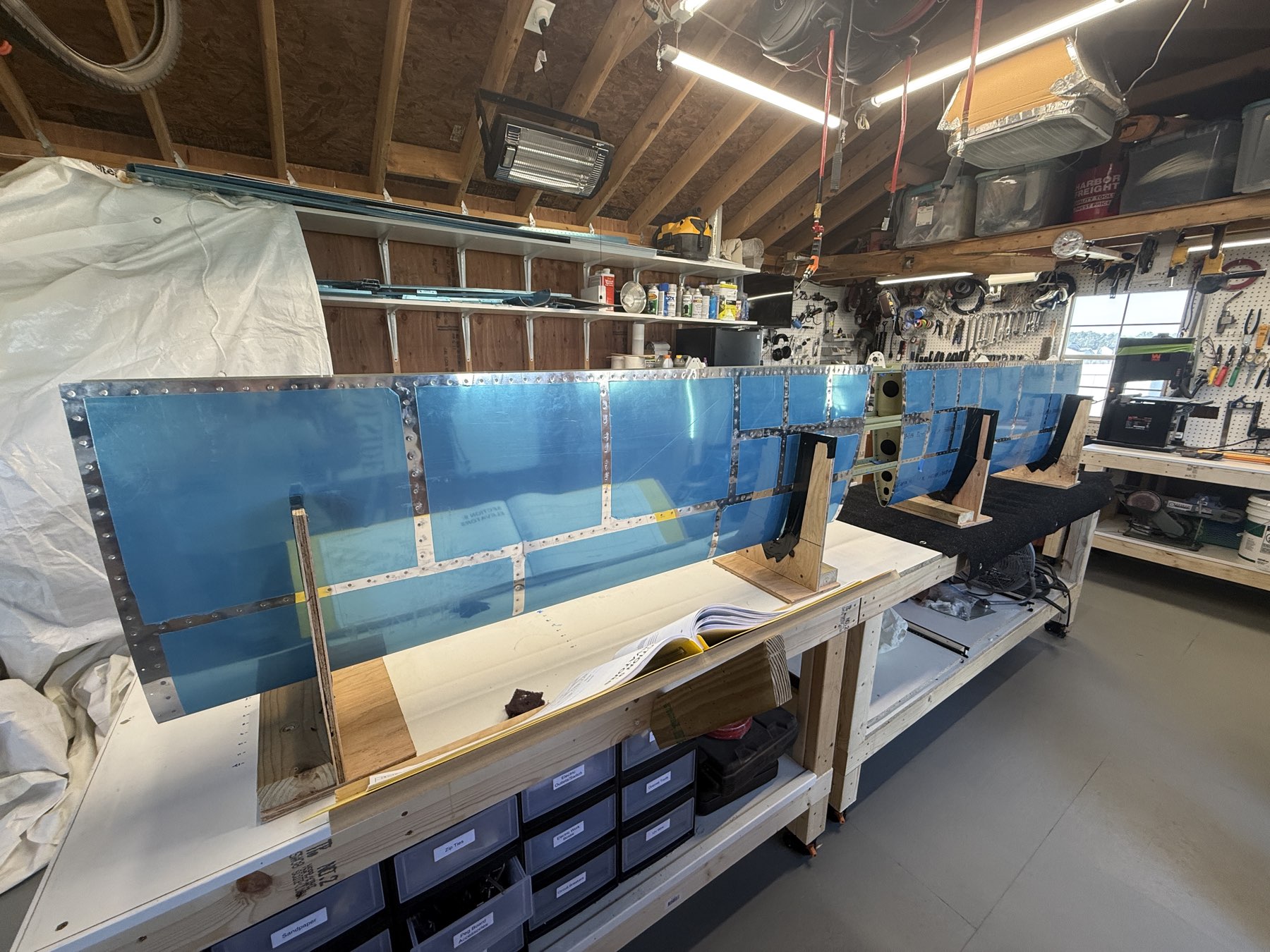 Completed riveting of the HS. Repaired hole created with dimpler on top aft HS skin by filling hole with structural epoxy and laying down a thin film between skin and spar in the area of the hole. Hole was outside of the intended dimple