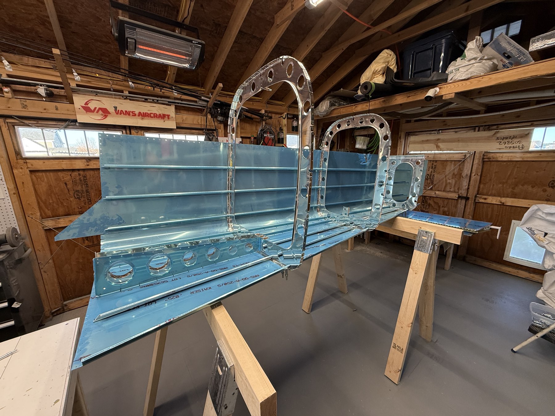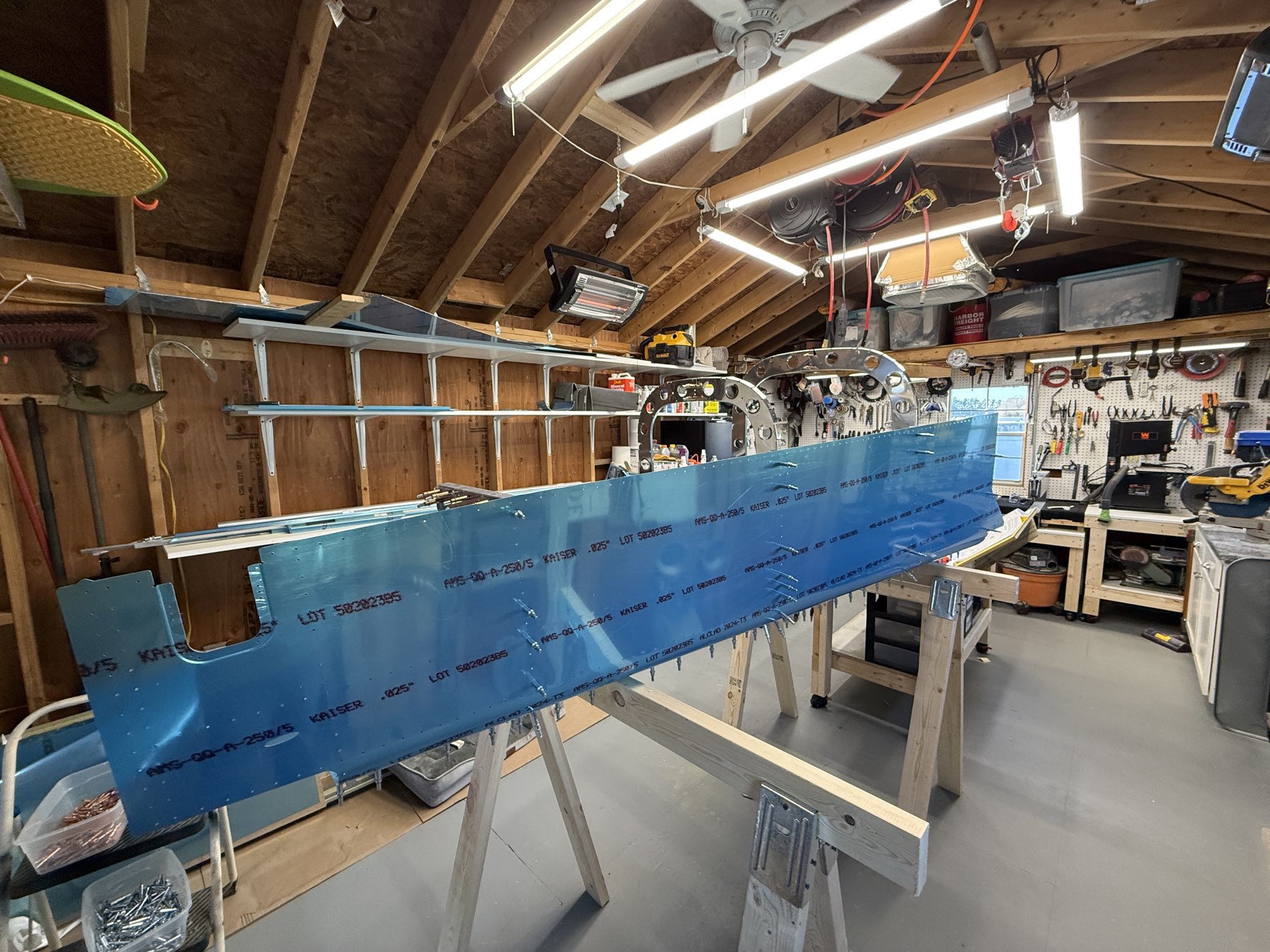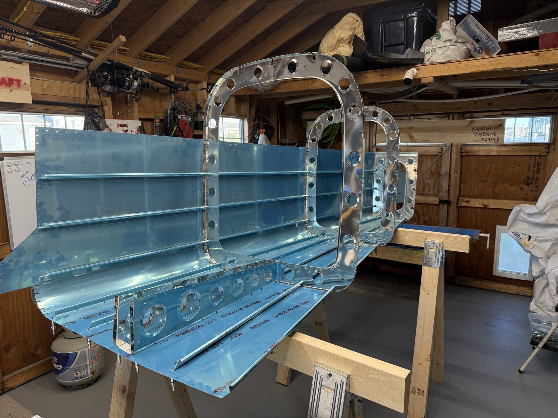 Began rough assemble of tailbone and bulkheads. Match drilled 3 stiffeners and lined up three additional stiffeners with the right side skin to prepare for match drilling. Autumn assisted with match drilling and clecos