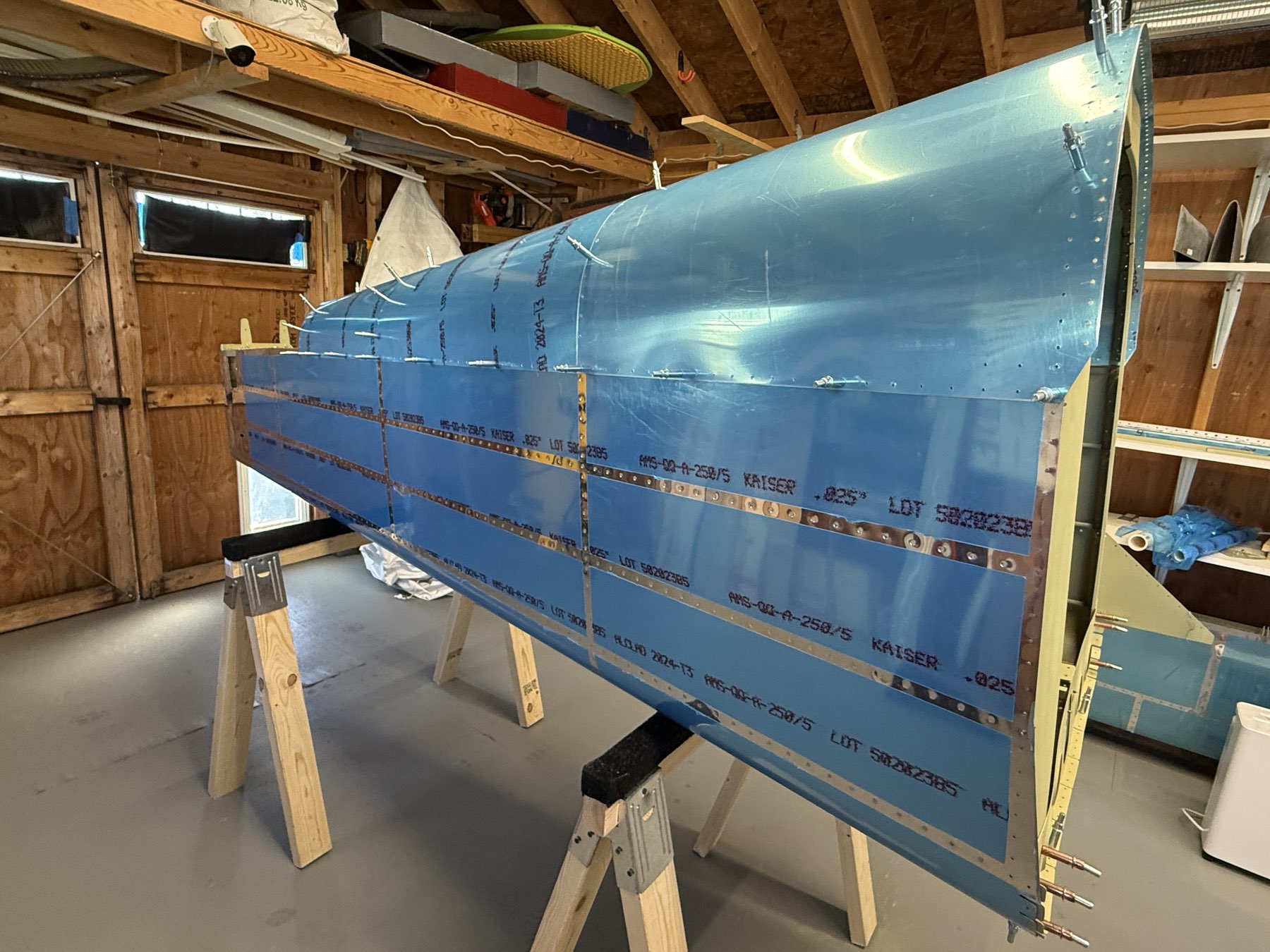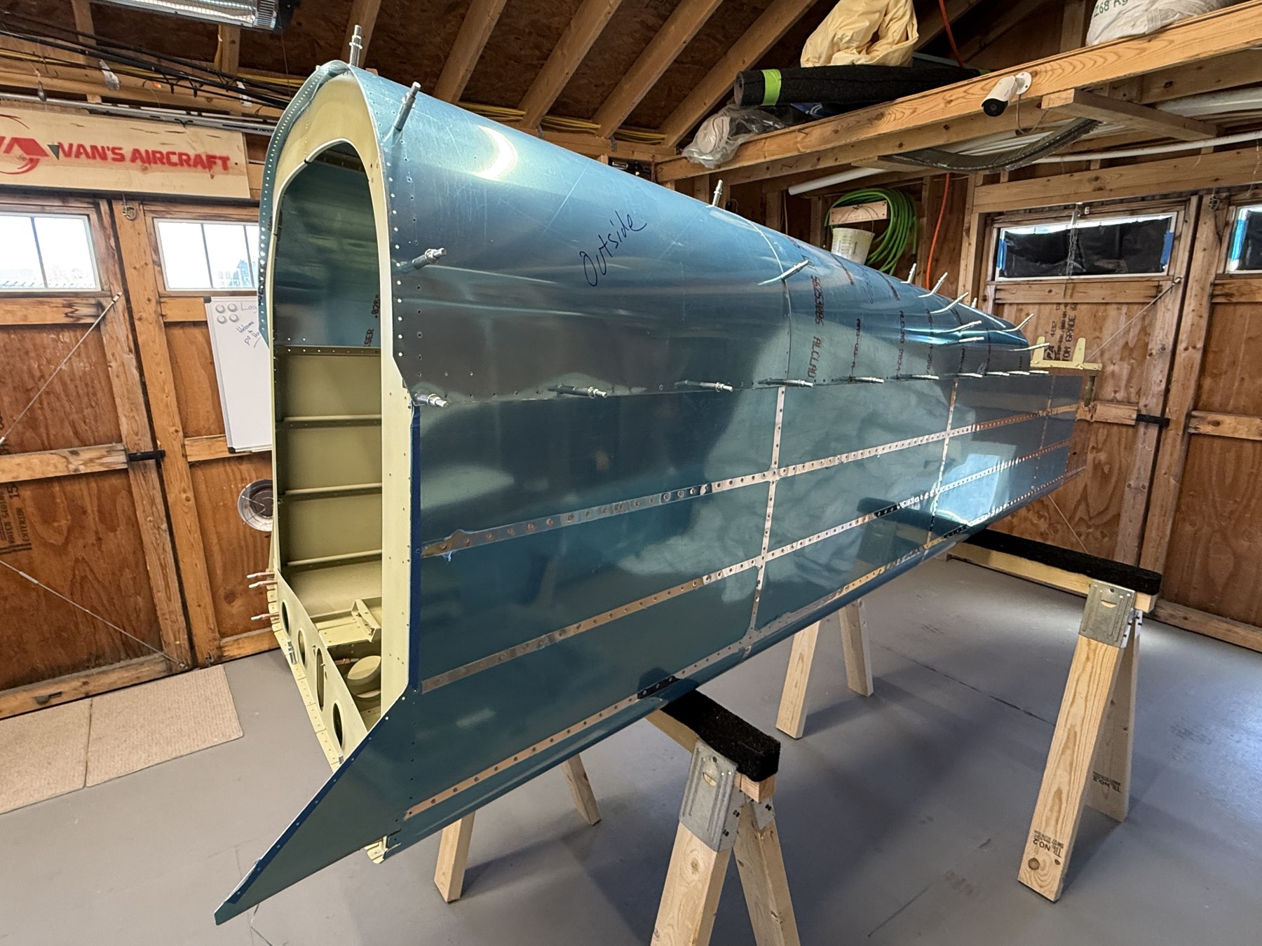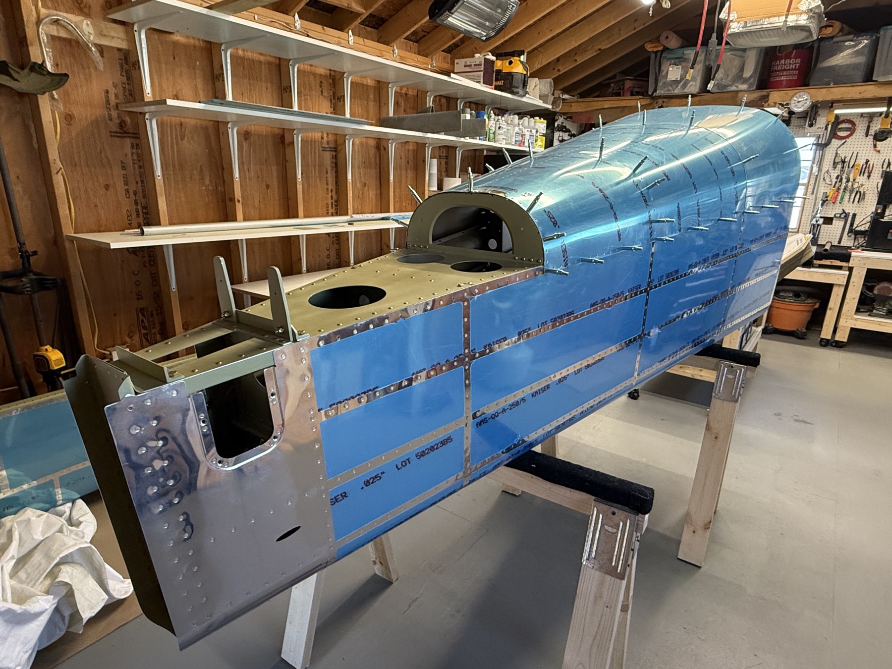 Completed tail cone final assembly with the exception of the two top skins. I’m leaving them aft one off for now mainly just in case I need to do any wiring/cabling in the tail where it will make it easier without having the skin on. I don’t expect the skin to take a significant amount of time to rivet on once I absolutely need to. The forward top skin gets riveted on when attached to the fuselage. Autumn helped today to get the bottom skins done.